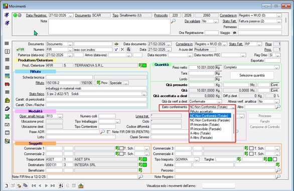 1- Settare il movimento con “Esito conferimento” non accettato = NC-IR-A: