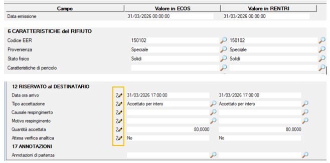 Il produttore e il trasportatore, dopo l’accettazione a destino da parte del secondo destinatario, potranno recuperare i dati della quantità accettata da Rentri con la funzione “Riprendi dati accettazione”.
