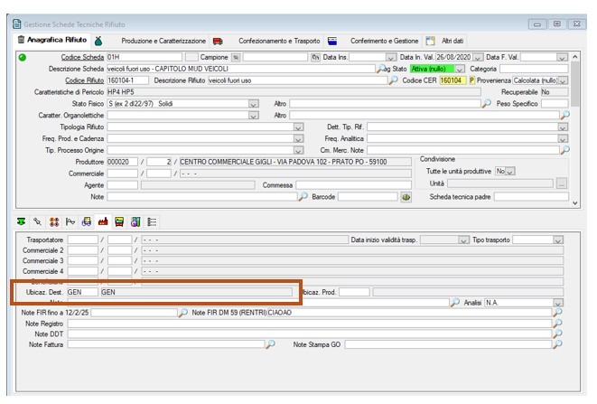 Se presente produttore e/ o destinatario occorre fare attenzione al soggetto e valorizzare ESCLUSIVAMENTE ubicazione produttore o ubicazione destinatario in funzione del soggetto.