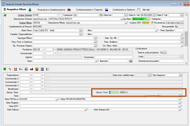 Inserisco una scheda con PRODUTTORE il mio impianto ( schede che mi servono per gli scarichi) –> VALORIZZO l’ubicazione PRODUTTORE.