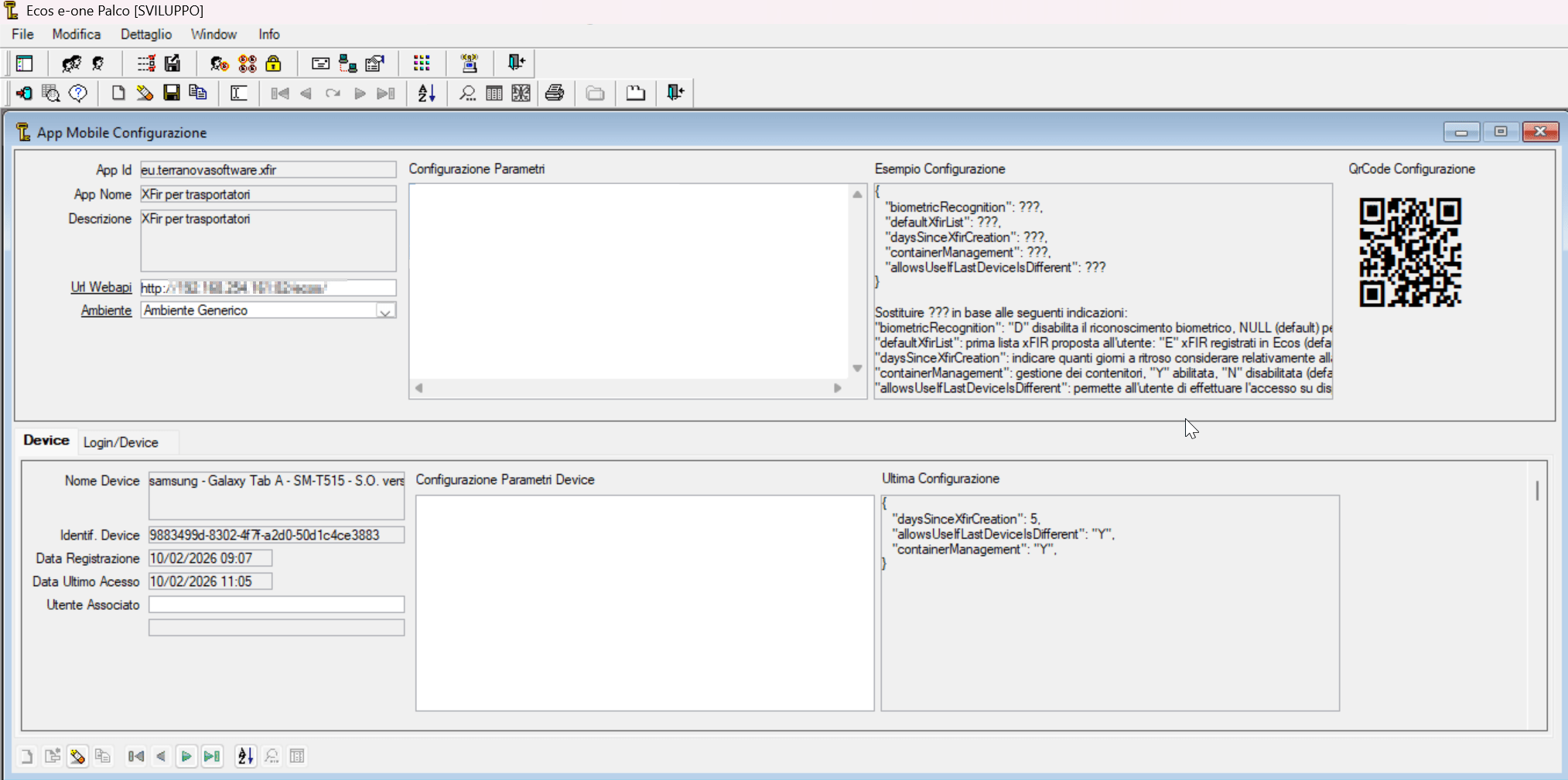 - Verificare i campi UrlWebapi e Configurazione Parametri;