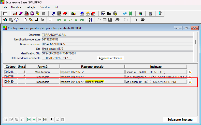 In questa maschera ogni sito deve avere sotto riportate una singola volta le specifiche attività, o la scelta “Tutti gli impianti”. NON possono esserci soluzioni ibride come la seguente: