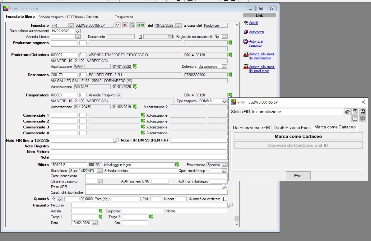 - Sistemazione della data di emissione FIR modificata con l’uso della funzione di trasformazione in cartaceo: se il documento digitale non era firmato, la data veniva impostata = oggi. Queste date verranno settate uguali alla data di partenza e ne sarà comunque permessa l’ulteriore modifica manuale nel movimento.