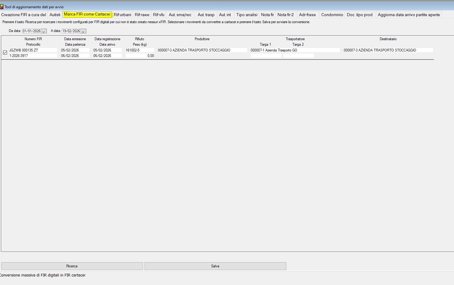 - Tool massivo per MARCARE come CARTACEO FIR inserito senza creazione in AVI. Dalla sezione RENTRI – AVANZATE — TOOL DI AGGIORNAMENTO sarà possibile effettuare la RICERCA automatica di tutti i movimenti che risultano essere in questo stato e poi confermare con SALVA